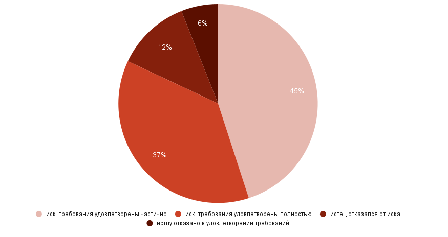 - Учитывая, что 73% ходатайств о проведении экспертизы исходили от ответчиков, также была изучена взаимосвязь между исковыми требованиями и судебными решениями.