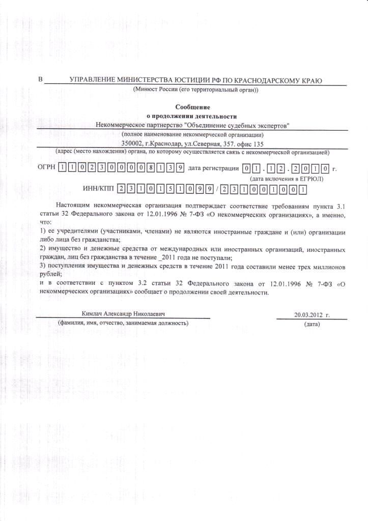Сообщение о продолжении деятельности, 2012 г.