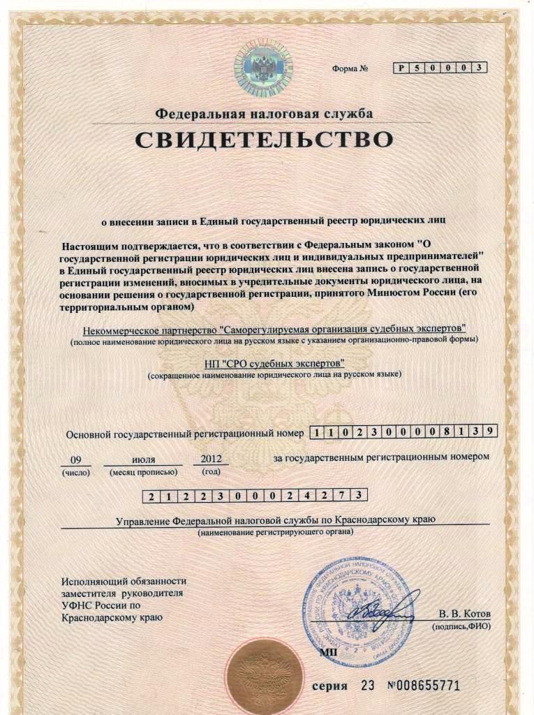 Свидетельство о внесении записи в ЕГРЮЛ